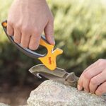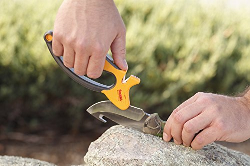 Simple and dependable, Smith’s Jiffy-Pro handheld sharpener is quick, protected, and easy to use in the field, back at camp, or in your house. Its knife sharpening slots incorporate crossed carbide blades used to set the edge on your blade and crossed ceramic rods used for honing the final edge to razor sharpness. These fixed abrasive components create a preset sharpening angle that guarantees results each and every time.