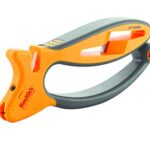 Pro Series. 7 5/8″ overall. Composition housing with soft grip maintain. Knuckle guard. Two-stage sharpening – coarse and fine. Features carbide and ceramic surfaces. Premium abrasives for a sharper cutting edge. Features large slot in maintains for game shears. Preset sharpening angles for excellent results each and every time. Designed for field or home use. Easily attaches to belt or backpack. Sharpens knives, scissors and game shears. Hang packaged.